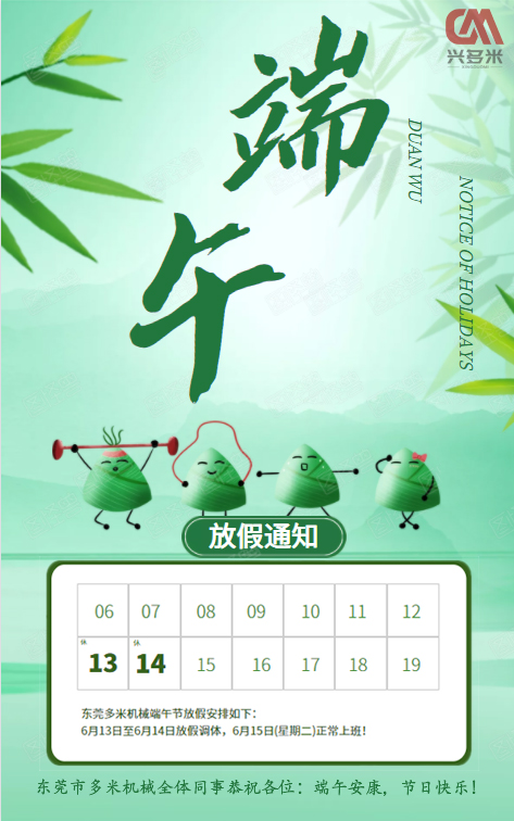 一年一端午,一歲一安康,又到了一年粽子飄香的端午節(jié),多米機(jī)械提前祝大家端午安康,節(jié)日快樂!多米機(jī)械公司放假時(shí)間為:2021年6月13日(本周日)至2020年6月14日(端午節(jié))共放假兩天,6月15日恢復(fù)正常上班。