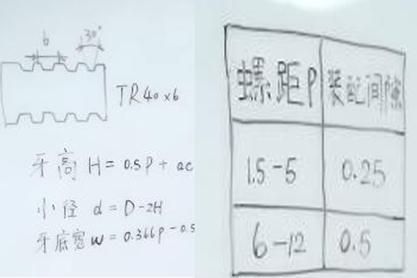 梯形螺紋怎么計算?今天我們一起來看一看,首先TR代表梯形螺紋,40表示大徑,6為6個螺距,角度為30,已經(jīng)知大徑為40,螺距為6,此時牙高H=0.5p+ac,其中ac表示裝配間隙,接下來我們再來看小徑d等于大徑減去兩倍的牙高,最后看一下牙底寬,W=-0.366p-0.536ac,同樣ac表示裝配間隙,那在這里我們可以看到螺距p和裝配之間的關(guān)系是當(dāng)螺距p為1.5-5時,裝配間隙為0.25,當(dāng)螺距p為6-12時,裝配間隙為0.5。